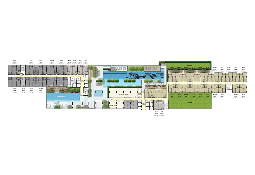 Floor 5 สระว่ายน้ํา, สระว่ายน้ําเด็ก, ห้องเปลี่ยนเสื้อผ้า, ห้องซาวน่า, ห้องออกกําลังกายพร้อมอุปกรณ์, ห้องเด็กเล่น, ห้องชุดพักอาศัย
